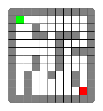 举个典型例子,如下图,灰色代表墙壁,绿色代表起点,红色代表终点,规定每次只能走一步,且只能往下或右走。求一条绿色到红色的最短路径。